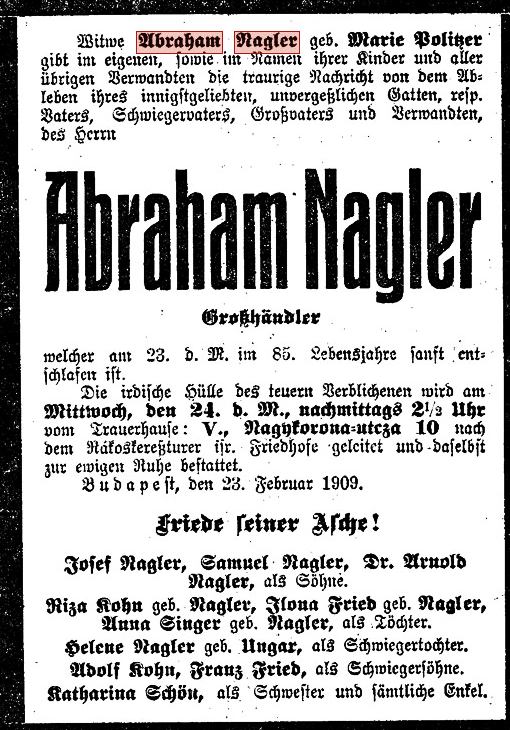 Vater: Abraham Nagler, gestorben 23. Februar 1909 in Budapest