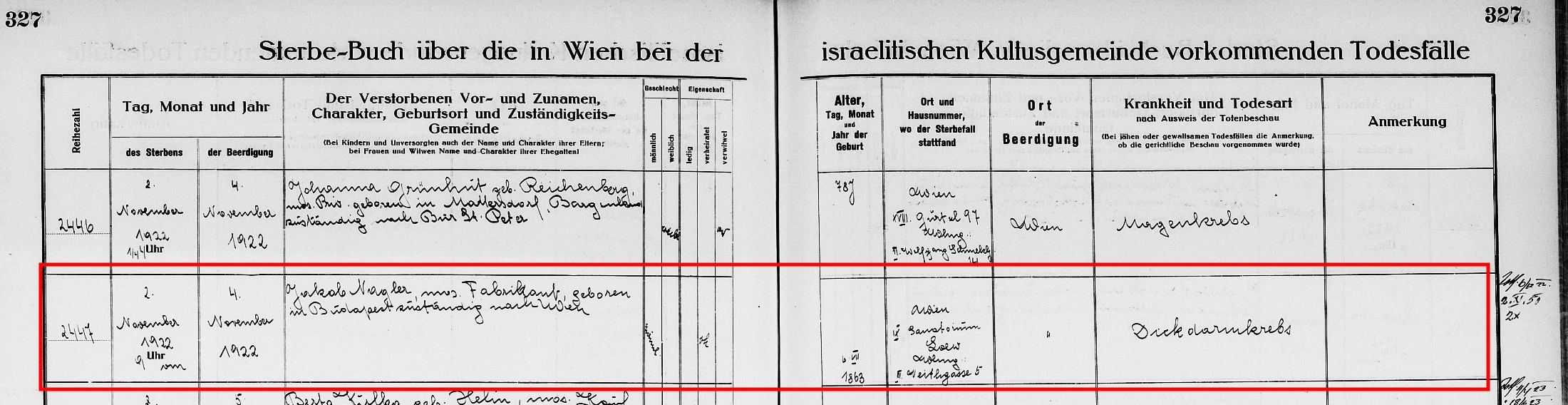 Eintrag Sterbebuch Wien, Jakob Nagler, 02. November 1922