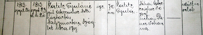 Netti Waittitz née Österreicher death record. Date of death: 23 Sep 1915. Age: 70. Birthplace: Mattersdorf. Place of death: Mattersdorf. Spouse: Gyula Voittitiz [sic]. Parents: Josef Österreicher and Johanna Bauer. Death reported by her husband on 24 Sep 1915, who signed his name Julius Woittitz.Nagymárton death registrations 1902-1920, FHL microfilm 0700405, page 13 entry 77. [Researched by CGV 2006]