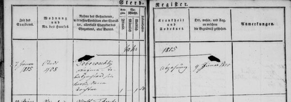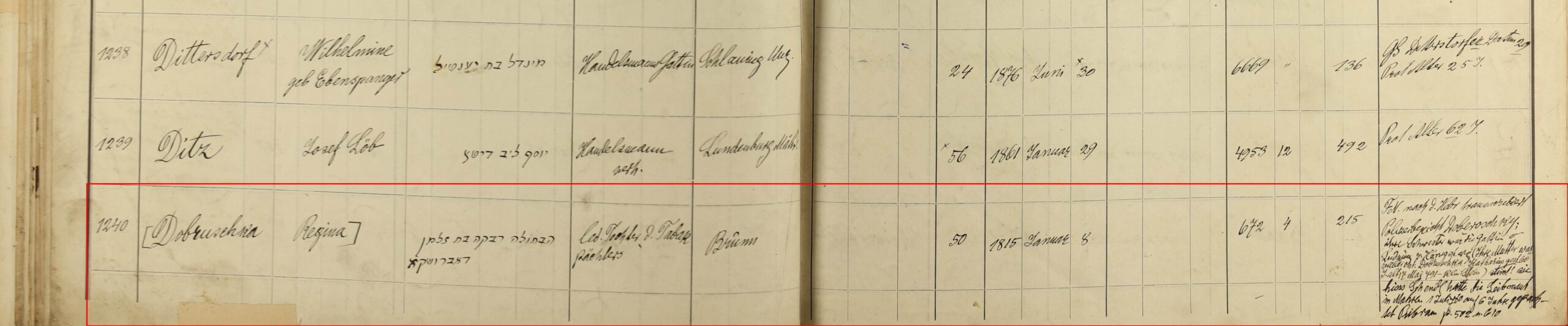 Regina (Rebekka) Dobruschka (Doberoschky) (zum Nachnamen siehe oben Anmerkung zu Zeile 7), geb. ca. 1765, Tochter des Tabakpächters Salman Dobruschka und der Schendl (s.o.), unverheiratet, gest. mit 50 Jahren an Abzehrung (zunehmende körperliche Schwächung) am 26. Tevet 775, am Ausgang des Schabbat = Samstag später Abend (im Jänner), 07. Jänner 1815 und wurde begraben am Tag 1 = Sonntag, 26. Tevet 575 = 08. Jänner 1815 am jüdischen Friedhof Währing, Gruppe 4, Nr. 215. Im Sterbebuch ist allerdings der 9. Jänner 1815 als Begräbnistag eingetragen, das wäre der Montag, Tag 2 der Woche.