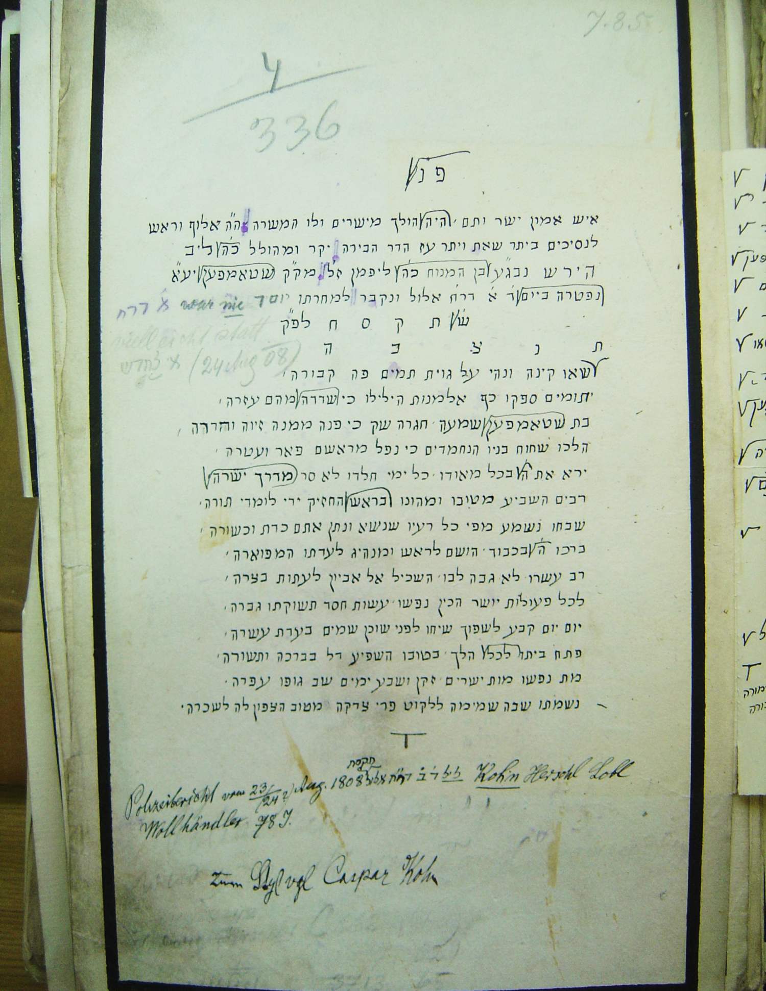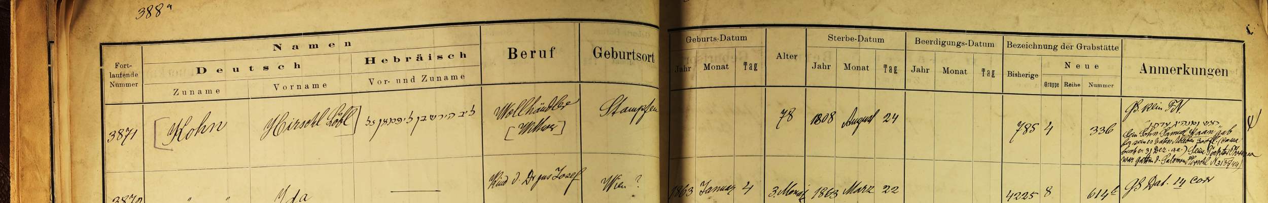 Löbl Hirschl Kohn, Sohn des Lipman, geb. ca. 1730 (sehr wahrscheinlich) in Stampfen (= heute Stupova in der Westslowakei), Wollhändler, gest. mit 78 Jahren am Dienstag später Abend, dem 1. N(eumond)t(ag) Elul (laut Polizeibericht in der Nacht vom 23. auf den 24. August) 1808 und wurde begraben am nächsten Tag, dem 24. August 1808?