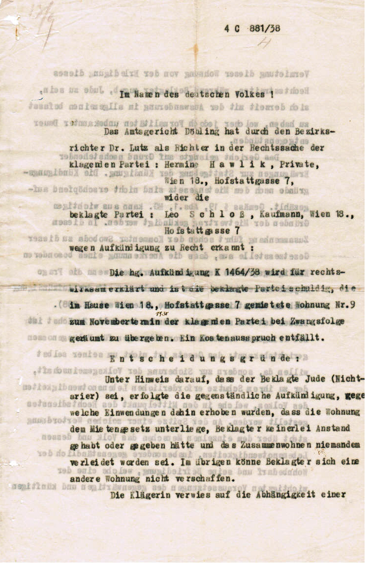 Unter Hinweis darauf, dass der Beklagte Jude (Nichtarier) sei, erfolgte die gegenständliche Aufkündigung, gegen welche Einwendungen dahin erhoben wurden, dass die Wohnung dem Mietengesetz unterliege, Beklagter keinerlei Anstand gehabt oder gegeben hätte und das Zusammenwohnen niemandem verleidet worden sei. Im übrigen könne Beklagter sich eine andere Wohnung nicht verschaffen.